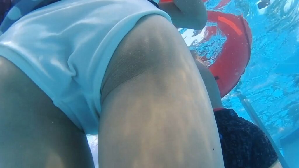 白の上下、黒地に白の水玉柄スカートの3ピース水着を水中撮影、真っ白な薄い生地のアンダーは、まるで下着(生パン)の様です。