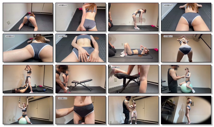 次に仰向けになってもらい、脚を少し開いた状態でまっすぐ上げる脚のトレーニングです。そのあと、仰向けのままM字開脚の姿勢を取ってもらい、股関節の柔軟を行いました。この時、僕の股間がギンギンになってしまいました…なんと股間をよく見ると、トレーニングウェアから莉乃さんの陰毛がはみ出ていたんです!!映像にはメガネカメラでしっかりその様子も収めているのでぜひ楽しんでいただきたいです。