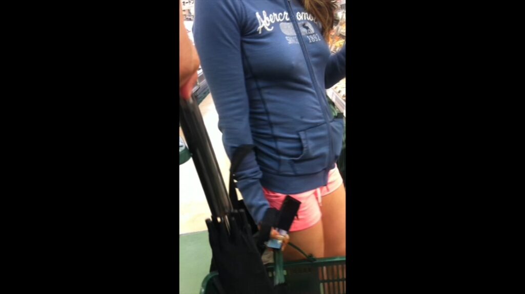 しかもスーパー店内はクーラーで寒いから乳首がポチッと立ってしまっていて良い眺めです。