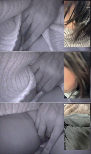 正面から手の甲を彼女の股の位置に下ろして密着!
