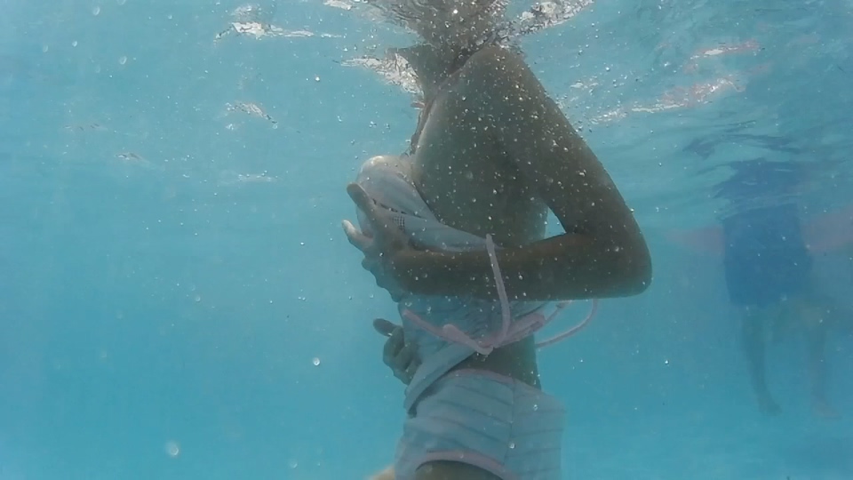 背中が大きく露出した白系のタンキニ水着を水中撮影。