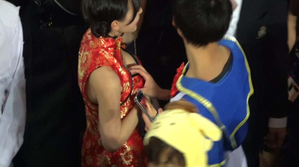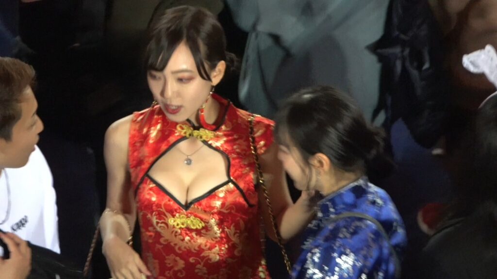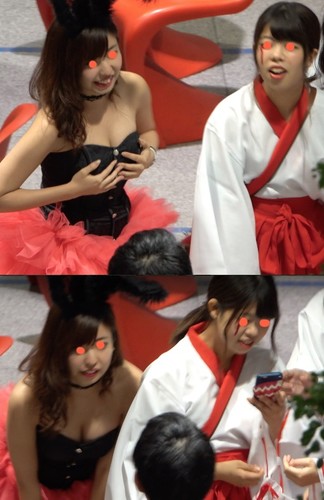 ハロウィン。黒赤バニーの子は、男性の視線を隣の子に取られそうになったからか胸をアピール?!チャイナ服で無双していた子は、写真をとった後に出会ったばかりの男に胸を揉まれる…これは演出か事故か…