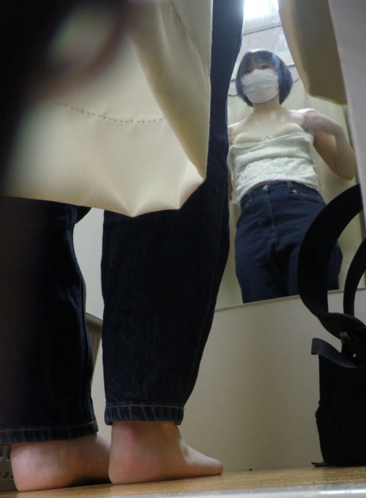 試着室。鏡越しの下着姿に胸がときめきます。モデル2名