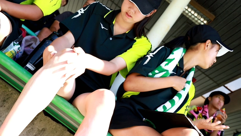 テニス女が豪快に目の前で可愛いふとももにクリームを塗る・・・